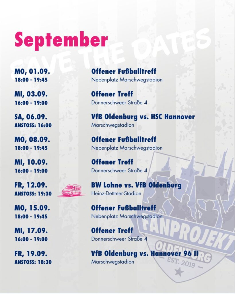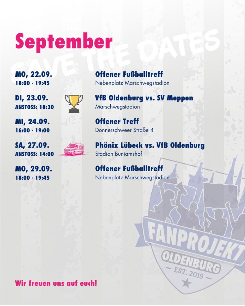 Der September ist vollgepackt mit spannenden Spielen und tollen Angeboten für euch! 💥 Ob beim Offenen Fußballtreff, dem Offenen Treff oder bei den Spielen des VfB Oldenburg – wir sind am Start und freuen uns auf euch!