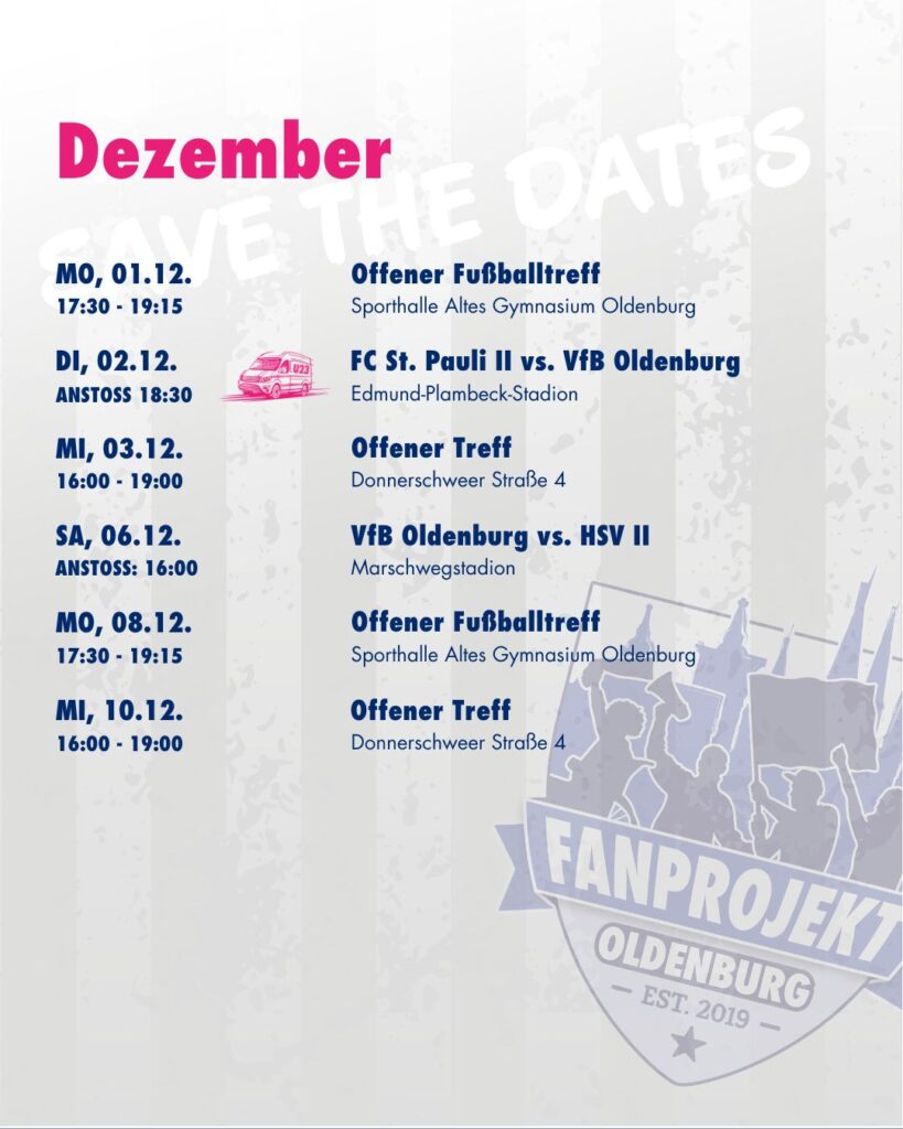 Die Tage sind kürzer geworden, so auch unser letzter Monat des Jahres 🕟 Zwei Spiele warten noch auf den VfB Oldenburg 💙🤍, darunter auch ein Nachholspiel: